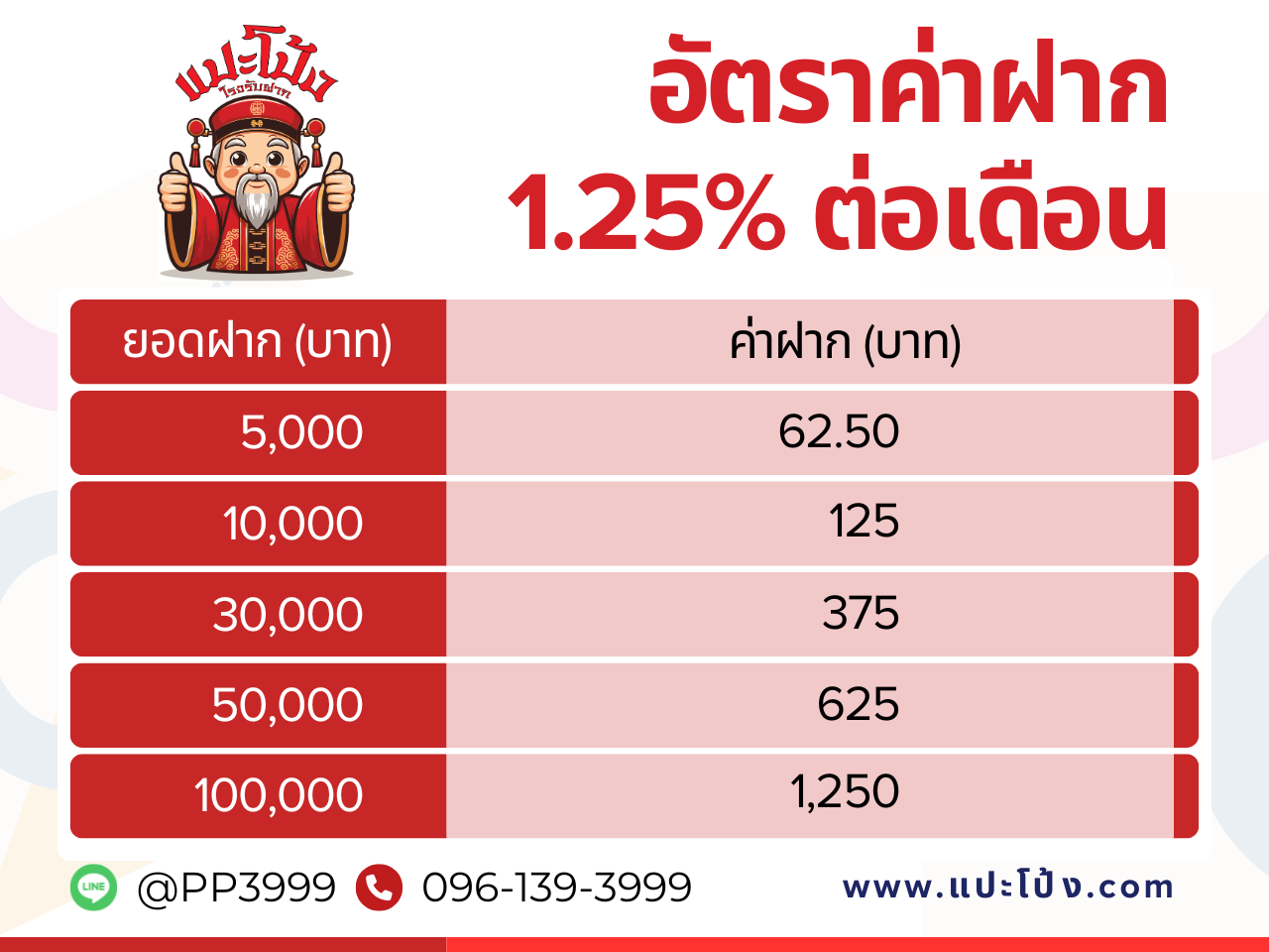 ด้วยประสบการณ์รับขายฝากมายาวนานหลายปี ให้บริการด้วยความจริงใจ มุ่งมั่นตั้งใจเพื่อให้คนไทย ได้รับการบริการทางด้านการเงินอย่างดีที่สุด ทำให้แปะโป้ง เป็นโรงรับฝากที่น่าเชื่อถือที่สุด ให้ราคาสูงสุดเท่าที่ทรัพย์จะเอื้ออำนวย โดยการประเมินจากผู้เชี่ยวชาญที่สั่งสมประสบการณ์ในการประเมินราคามากกว่า 15 ปี